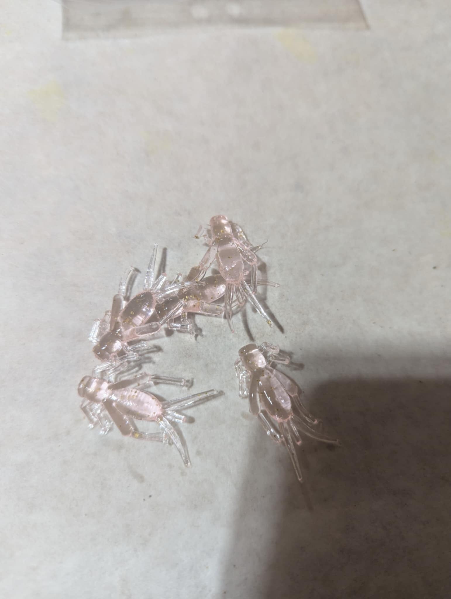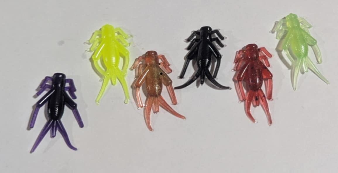 All crickets are made from ultra clear medium prastisol. Infused with garlic crawfish oil.